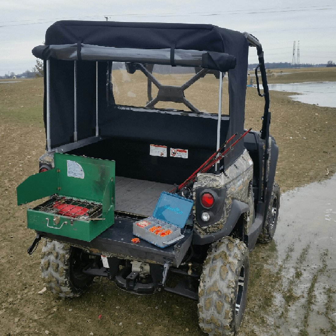 Your Kymco UXV 450 is a workhorse; keep your tools and hunting equipment dry with this Camper Top Bed Cover by Pro Rhino Racing Products without losing any bed space. The cover allows you to enclose your larger items and still have quick access using your tailgate. On those long hot days in the fields, the cover provides shade for yourself while eating lunch or taking a much needed break. You can even use the dumping feature on your machine without having to uninstall the cover.