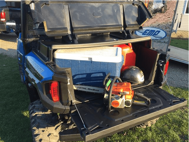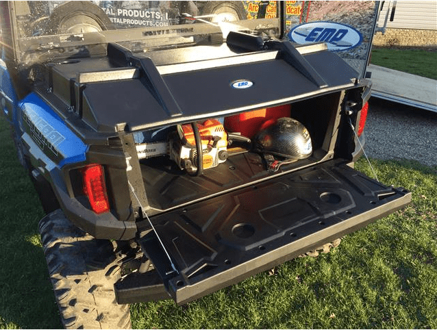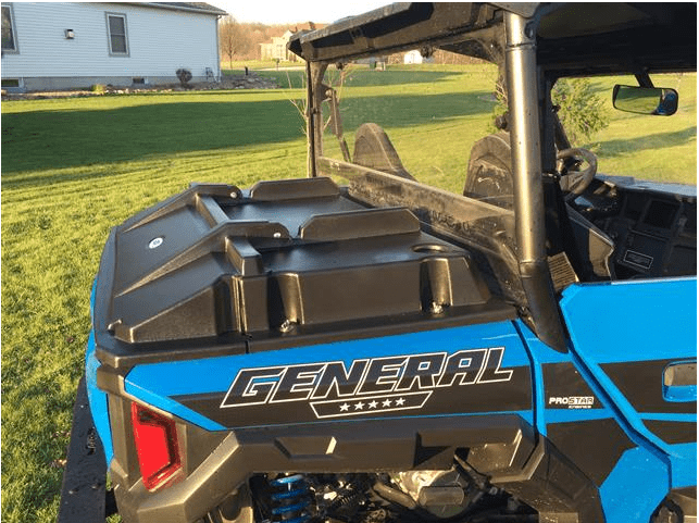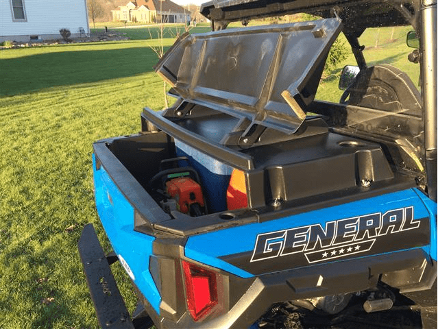 The bed of your Polaris General 1000 has plenty of room for your cargo and with the EMP bed cover there's no need to worry about keeping the dust, mud, and rain off your gear. EMP has made every effort to impress with this must have travel companion. With the front section being 4" taller than your machine's stock bed, you'll still have room for all the must haves for any long trip and a full-size cooler stocked with your favorite cold beverages. EMP even molded the durable plastic with 2 cup holders on the top front so you have a place to set your drink while you unpack after a long ride.