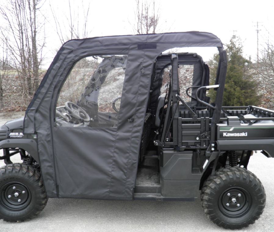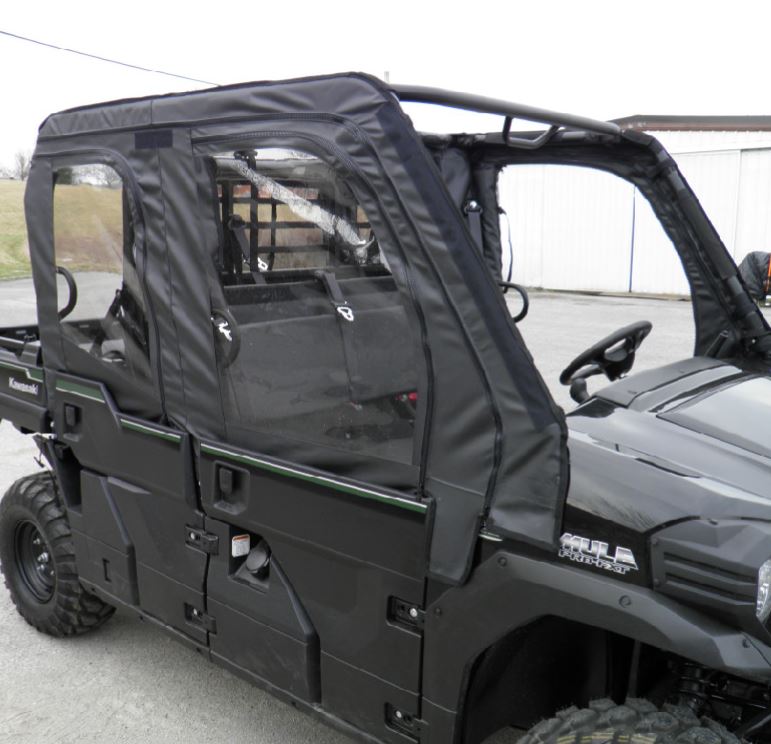 Wrapping your rig up for the winter months to give you reprieve from the cold is a must. Suppose you are looking for a way to complete a cab enclosure with an already existing hardtop and front windshield. In that case, you need to take a look at this Kawasaki Mule Pro-FXT or Mule Pro-DXT 3 Star Soft Doors and Rear Window combo. This configuration adds UTV doors and a rear panel to your pre-existing components, allowing you to save money.