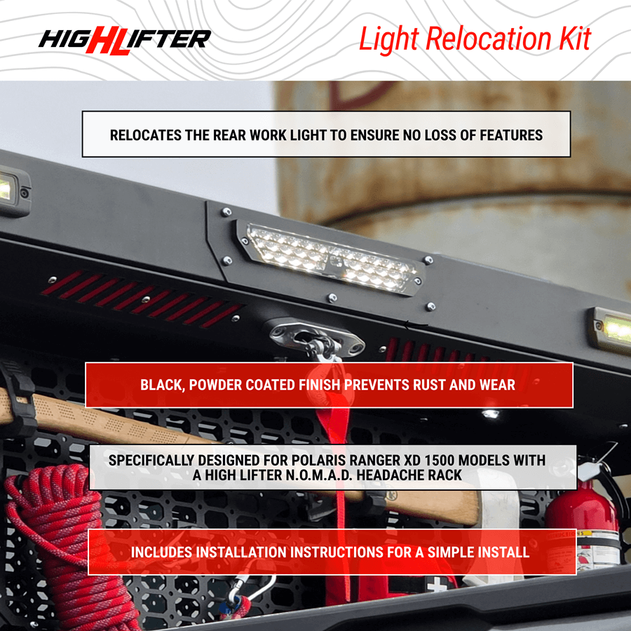 The High Lifter N.O.M.A.D. Headache Rack Cargo Light Relocation Kit is a practical upgrade that helps improve rear visibility on your Polaris Ranger XD 1500 when equipped with the N.O.M.A.D. Headache Rack. This kit makes it easy to move the factory cargo light from its original spot to the headache rack, ensuring the bed area stays well-illuminated even when you're hauling gear, using a roof accessory, or adding extra lighting. By relocating the cargo light higher and further back, you get better lighting coverage exactly where you need it most during nighttime work or trail adventures.