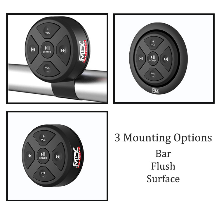The MTX Audio Bluetooth, Amp, and Speaker Kit for side by sides is an excellent choice for casual riders and those who like to pin the needle in smaller bikes. It's a UTV Bluetooth sound system designed with a compact amplifier, a media receiver, two LED RGB speakers, and wiring, including 3.5mm aux cords. For those looking for more accessibility, there is also an optional LED speaker controller.Marine-grade UTV Bluetooth radio
