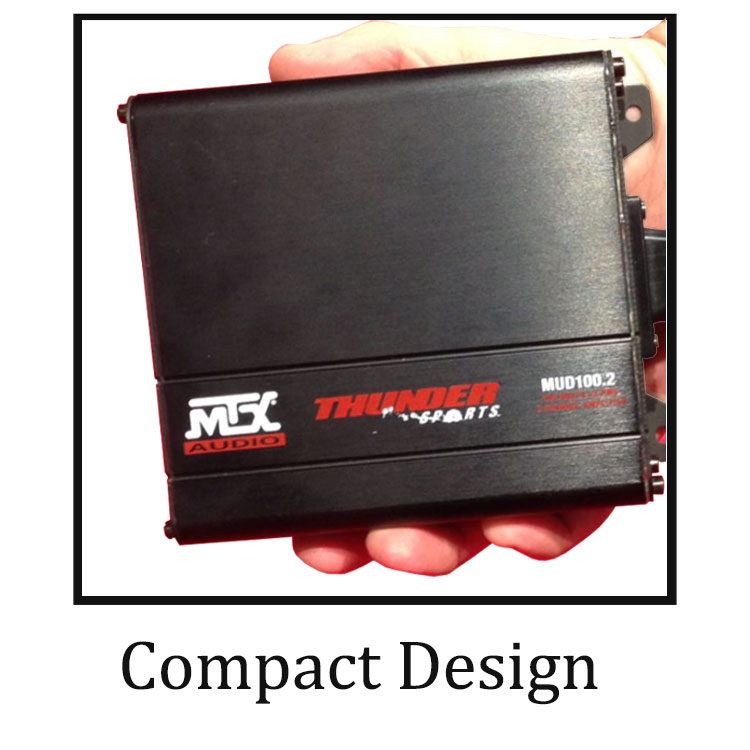 The media player consists of a rocker switch with weatherized rubber buttons. It replaces the head unit, being compatible with any amplifier. Additionally, the media player has RGB backlit buttons allowing easy accessibility day or night. Finally, MTX uses hassle-free Bluetooth auto-pairing technology for convenience.Speaker and Amplifier Dynamic Duo