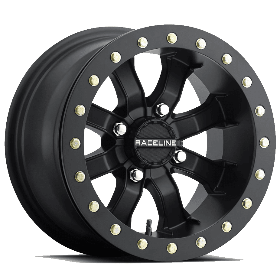 - Includes (1) wheel, (1) black 6061 beadlock ring, and (1) satin black snap-in cap with embossed chrome Raceline logo