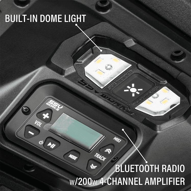The SSV Works 2-Speaker Overhead Soundbar for the 2024 to 26 Polaris RZR XP 1000 is a plug-and-play, factory-fit audio upgrade designed specifically for off-road use. The fully pre-assembled unit mounts directly to your roll cage without interfering with headroom and includes two weather-resistant 6.5 inch SSV A6 speakers. At its core is the MRB3S Bluetooth radio with a built-in 200-watt 4-channel amplifier offering Bluetooth streaming, AM/FM, and aux-in — all in a weather-proof housing, ready for sun, rain, mud, or snow. For extra practicality, the soundbar includes a built-in dome light for increased visibility on night rides. Rugged construction, UV-resistant materials, and SSV’s “factory-fit & finish” design give it a clean, integrated appearance that looks like it came with the vehicle.