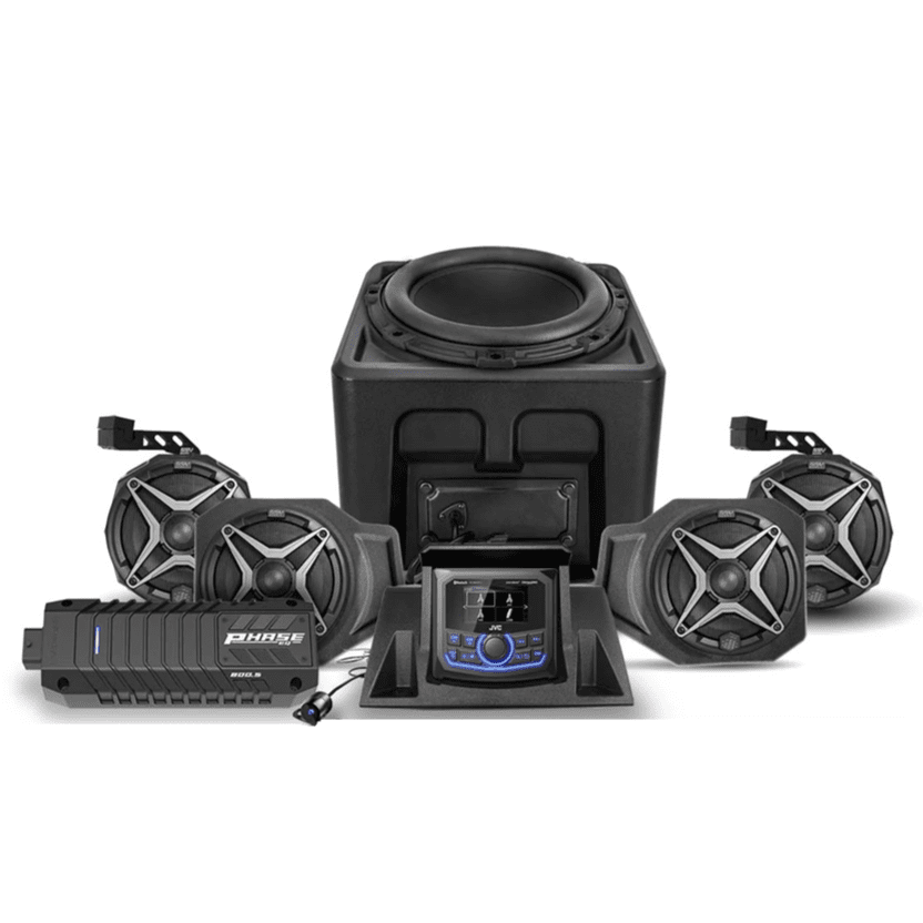 The SSV Works A-Spec 5-Speaker Audio System with JVC is a complete, powerful audio solution designed to bring exceptional sound quality to your 2018-24 Polaris Ranger XP 1000. This system delivers an immersive soundstage by including a JVC media receiver, two front kick panel speakers, two rear cage-mount speakers, and a deep-hitting 10-inch subwoofer, all driven by a Phase EQ amplifier. The core benefit of this kit is the advanced Phase EQ Amplifier which features Digital Signal Processing (DSP) tuning. This technology is specifically tailored to your vehicle and the components, optimizing frequencies to maximize power output and deliver clean, loud audio that overcomes the noise of the engine and the open trail.