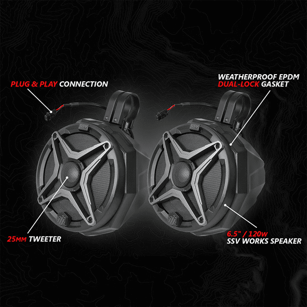 - (2) 6.5-inch rear cage mount speaker pods w/ SSV Works speakers