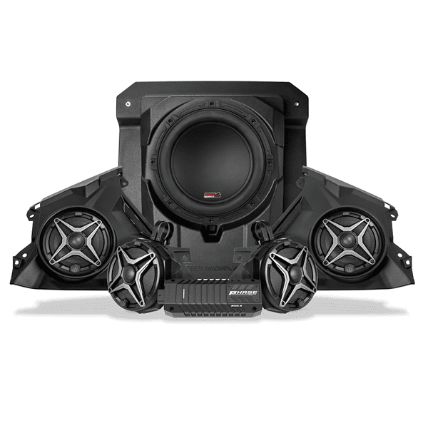 The SSV Works Phase-4 A-Spec 5-Speaker System for the Can-Am Maverick R provides a complete, immersive audio experience, perfectly balancing impressive sound quality with essential off-road durability. This comprehensive kit features an 800-watt power output, utilizing two high-fidelity 6.5-inch A-Spec dash speakers and a powerful 10-inch subwoofer housed in a vehicle-specific under-seat enclosure. The entire system is driven by a 5-channel Phase EQ amplifier that is DSP-tuned to the Maverick R, ensuring your music is processed for maximum clarity, volume, and deep, resonant bass that cuts through the noise of any high-speed run or challenging trail.